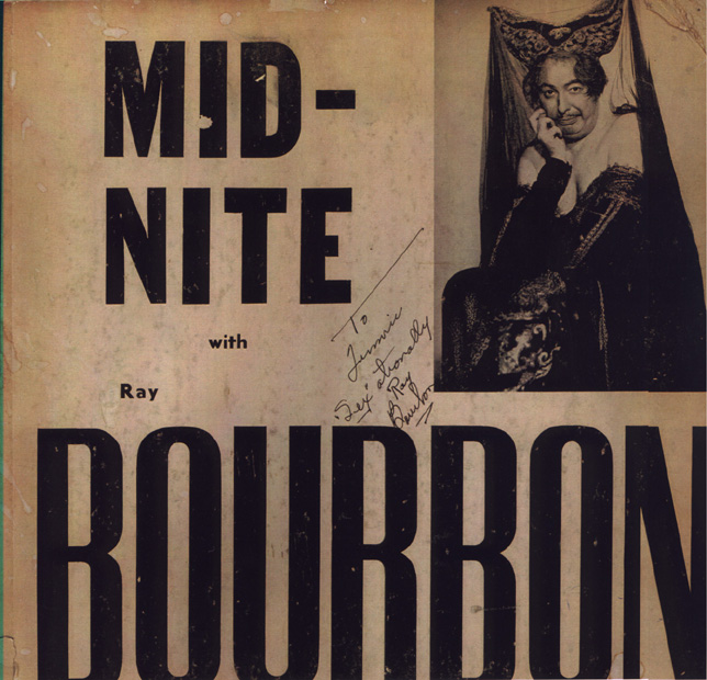 Also extant is the cover sleeve only of a 10" recordwhich may have contained a 78 rpm, but more likely a 10" LPentitled "Mid-Nite With Ray Bourbon". The single known cover is autographed (as is one known copy of "Yes, It Is Ray Bourbon") and does appear to have actually contained a record, rather than being some sort of "test" cover. Whether it was an alternate cover to the above, some other known record, or something else entirely, remains a mystery.